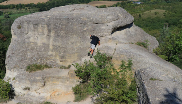 hogy a mindinkább fokozódó hőség sem kurtítja meg utunkat. Szerencsére megint hűvösebb erdőbe fordult az út, s alig százméteres kaptató után Dobogó hegyére értünk. Lám, nem csak a Pilisben van Dobogó… Vagy félkilométernyit baktatva, Torbágy felé kezdett fordulni az út, és cseres-tölgyes újulatban folytatódott. Ezen haladtunk tovább, már amikor a marasztaló vadrózsagallyak és a szederinda megengedték. Karunkat, combunkat igazán szép kottavonalak díszítették, mire kiértünk belőle. A P sáv kisvártatva északnak fordult, mindjárt két lehetőséget kínálva, igaz, mindkettő inkább egy-egy most épülő csúszdának tűnt. Leérkezésünk lendülete hamar véget ért, miközben következő célpontunkat, a Hármas sziklát próbáltuk, hébe-hóba négykézláb, elérni. Innen már szintvonalon sétálhattunk a Négyeshez, meg a legutolsó, számot már nem is kapott sziklához. Nem volt könnyű feljutni, a hőség is most járt csúcsra, de az elénk táruló panoráma bőven kárpótolt bennünket.