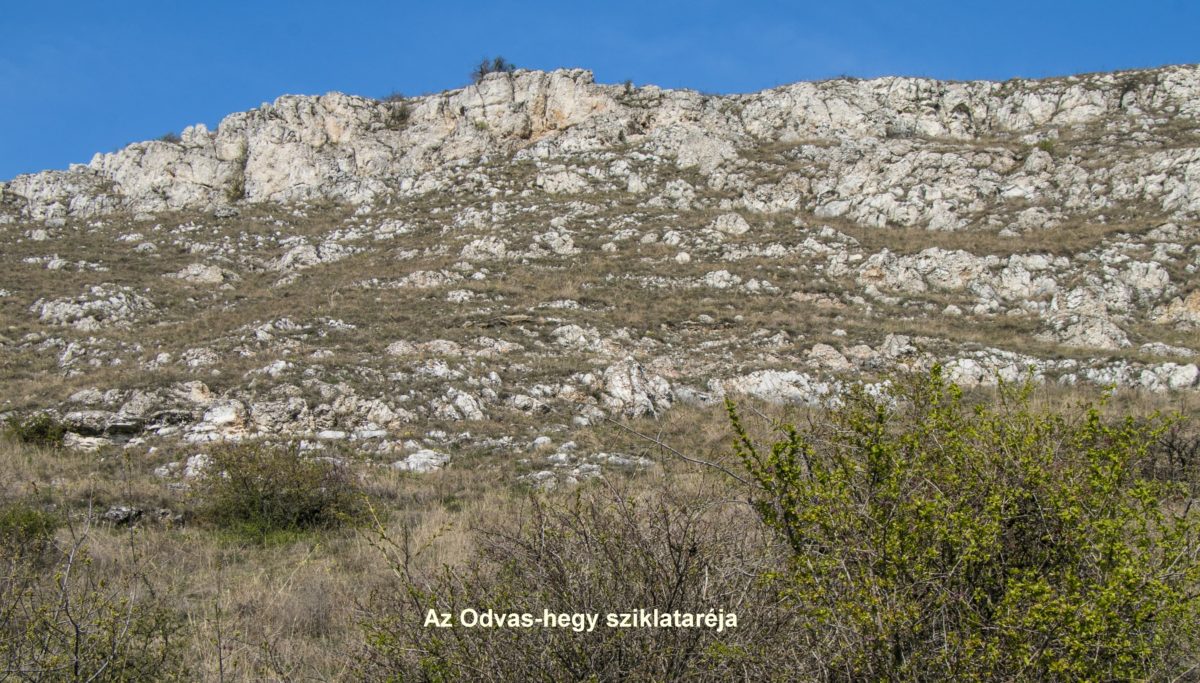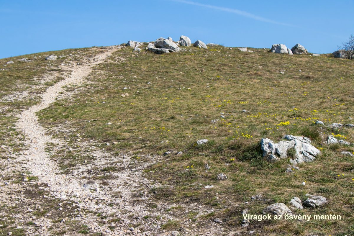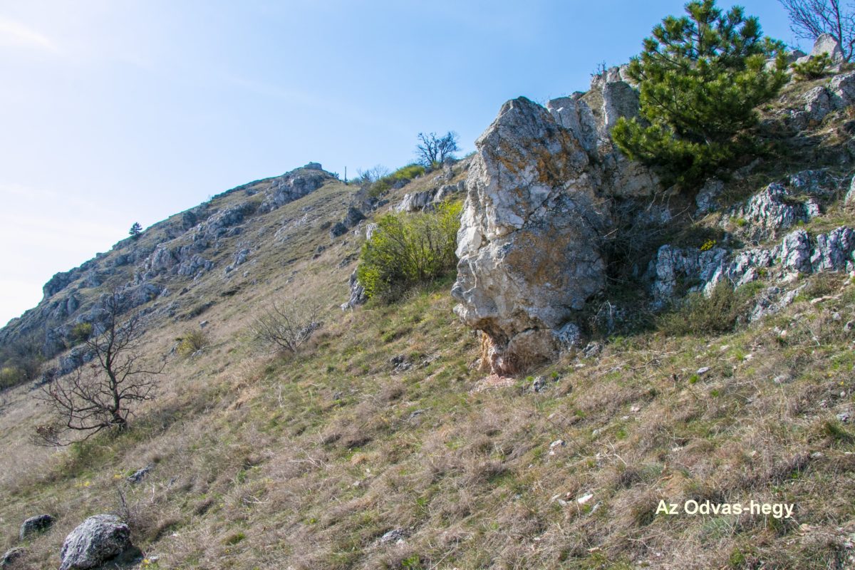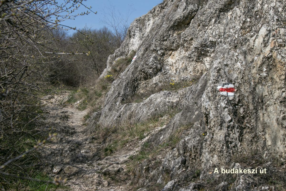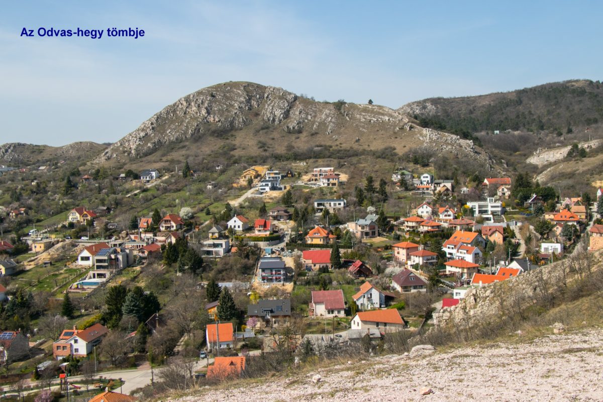 Elindulva a Budakeszi úton, azon északnak fordultam. A piros sáv hamarosan jobbról-balról sziklák közé szorított, kanyonszerű ösvényben folytatódott, amibe kisvártatva balról egy csapás torkollott. Ez vezet fel arra a meredeken kiemelkedő, hatalmas dolomit-tömbre, amit Odvas-hegyként jelez a térkép. A felvezető út az elején cseppet sem könnyű, néhol csak nagyon megfontolva lépkedhetek. Aztán, egy sziklatömb után, kényelmes ösvény jön elém, amelyik a hegy lábánál tekereg, olykor egy-egy ház kerítése mellett. Csak a térképről tudom, hogy most egy tanösvényen haladok, mert bizony ösvény még csak-csak, de tan aztán sehol sincs. Még jó, hogy látvány legalább van… A csapás aztán szelíd jobb kanyarral a hegy gerincének irányába fordul, mellette egymást érik a hérics és a kétféle kökörcsin telepei. Ahogy emelkedem, úgy nehezedik a terep, mindinkább görgetegessé válva. Lassú a tempó, hol a lábam elé kell nézni, hol meg élvezni a látnivalókat, a kettő együtt nem megy. Felérve a 315 m magas csúcsra, sziklára telepszem, és ebédidőt tartok. Aztán már a lefelé jön, de bizony a 4-5 centis dolomit-csörmőn meg kell küzdeni, mire visszaérek a piros sávhoz. Az egész kitérő mindössze másfél kilométer volt.