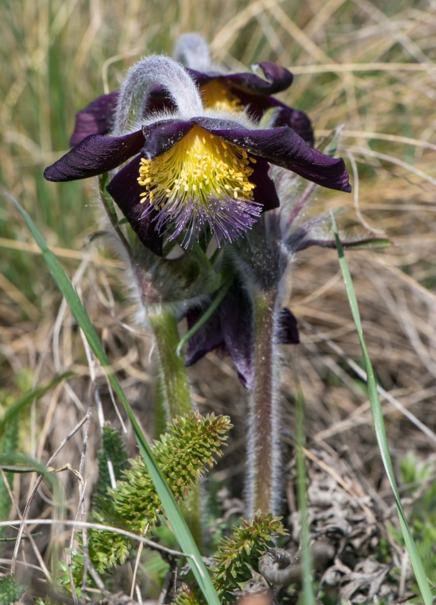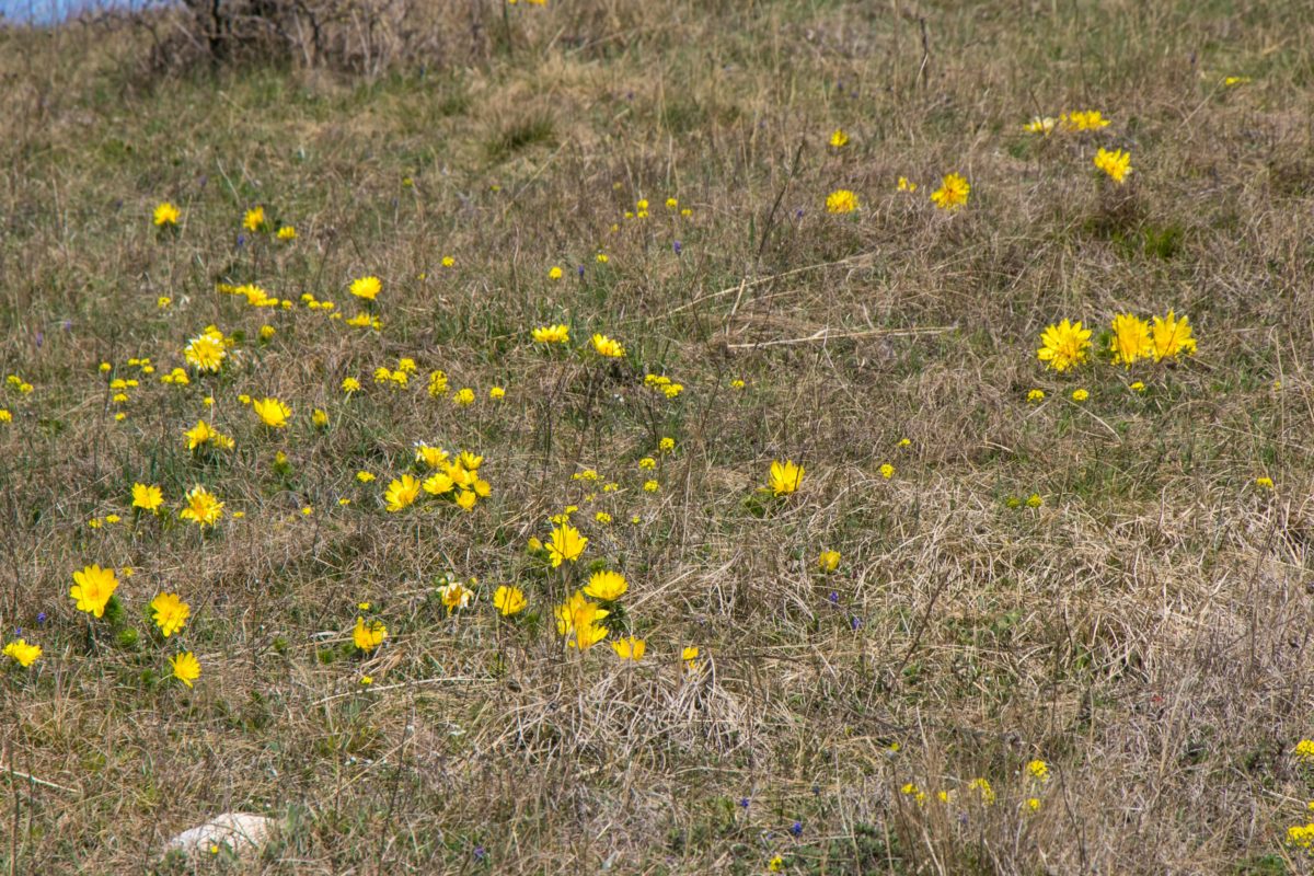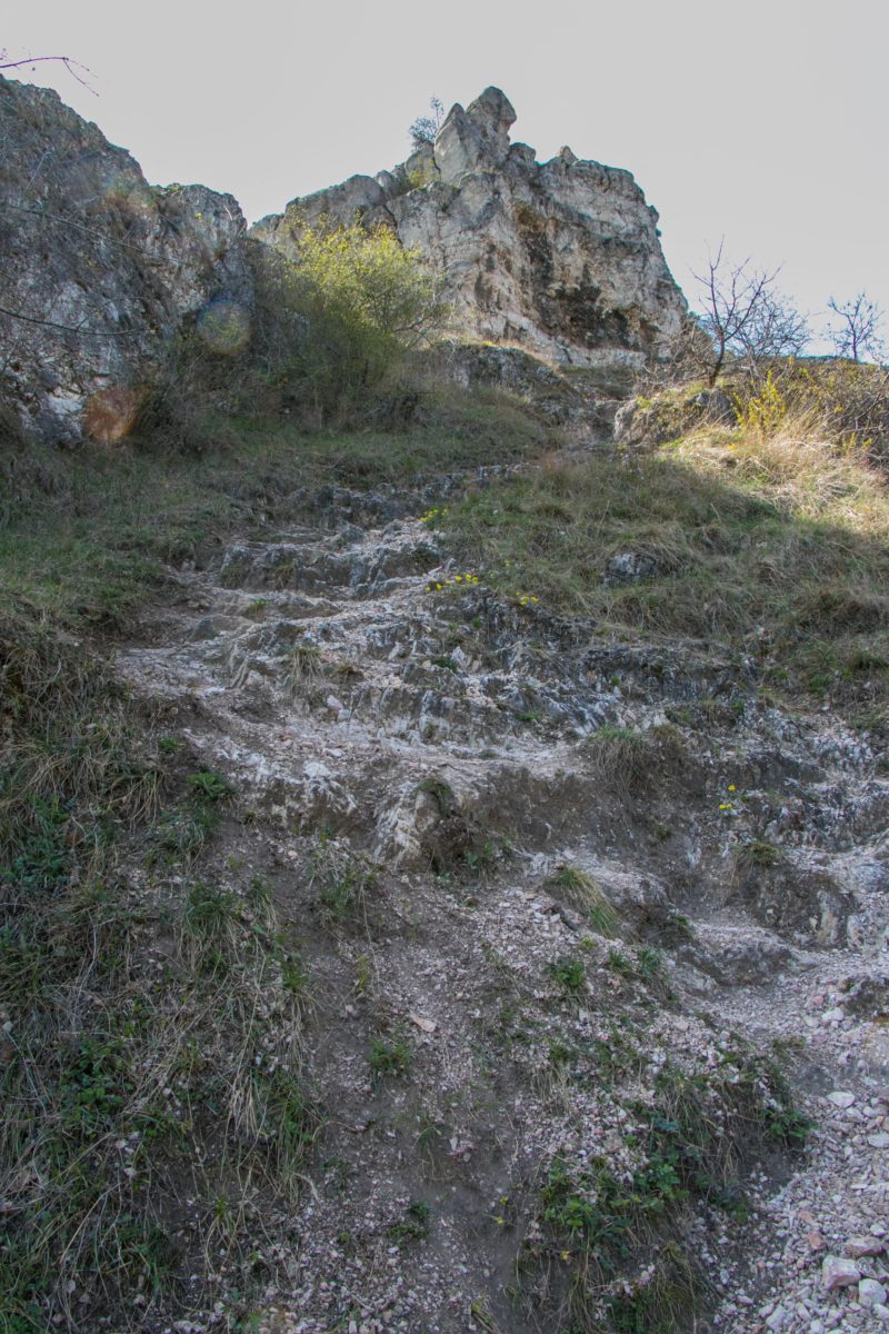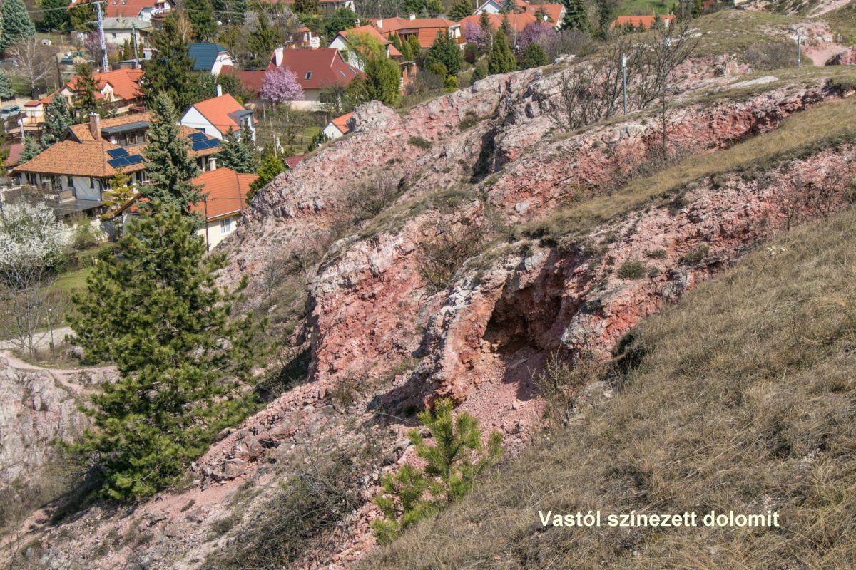 Elindulva a Budakeszi úton, azon északnak fordultam. A piros sáv hamarosan jobbról-balról sziklák közé szorított, kanyonszerű ösvényben folytatódott, amibe kisvártatva balról egy csapás torkollott. Ez vezet fel arra a meredeken kiemelkedő, hatalmas dolomit-tömbre, amit Odvas-hegyként jelez a térkép. A felvezető út az elején cseppet sem könnyű, néhol csak nagyon megfontolva lépkedhetek. Aztán, egy sziklatömb után, kényelmes ösvény jön elém, amelyik a hegy lábánál tekereg, olykor egy-egy ház kerítése mellett. Csak a térképről tudom, hogy most egy tanösvényen haladok, mert bizony ösvény még csak-csak, de tan aztán sehol sincs. Még jó, hogy látvány legalább van… A csapás aztán szelíd jobb kanyarral a hegy gerincének irányába fordul, mellette egymást érik a hérics és a kétféle kökörcsin telepei. Ahogy emelkedem, úgy nehezedik a terep, mindinkább görgetegessé válva. Lassú a tempó, hol a lábam elé kell nézni, hol meg élvezni a látnivalókat, a kettő együtt nem megy. Felérve a 315 m magas csúcsra, sziklára telepszem, és ebédidőt tartok. Aztán már a lefelé jön, de bizony a 4-5 centis dolomit-csörmőn meg kell küzdeni, mire visszaérek a piros sávhoz. Az egész kitérő mindössze másfél kilométer volt.
