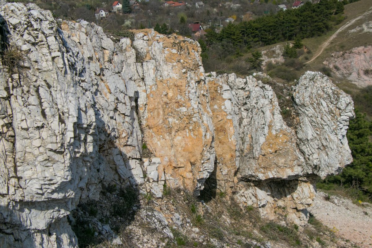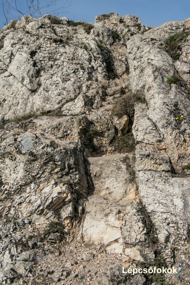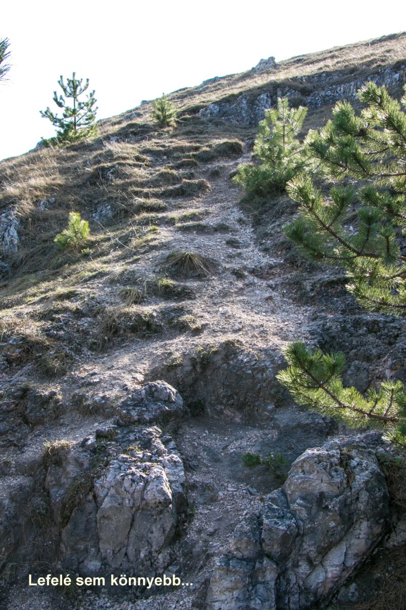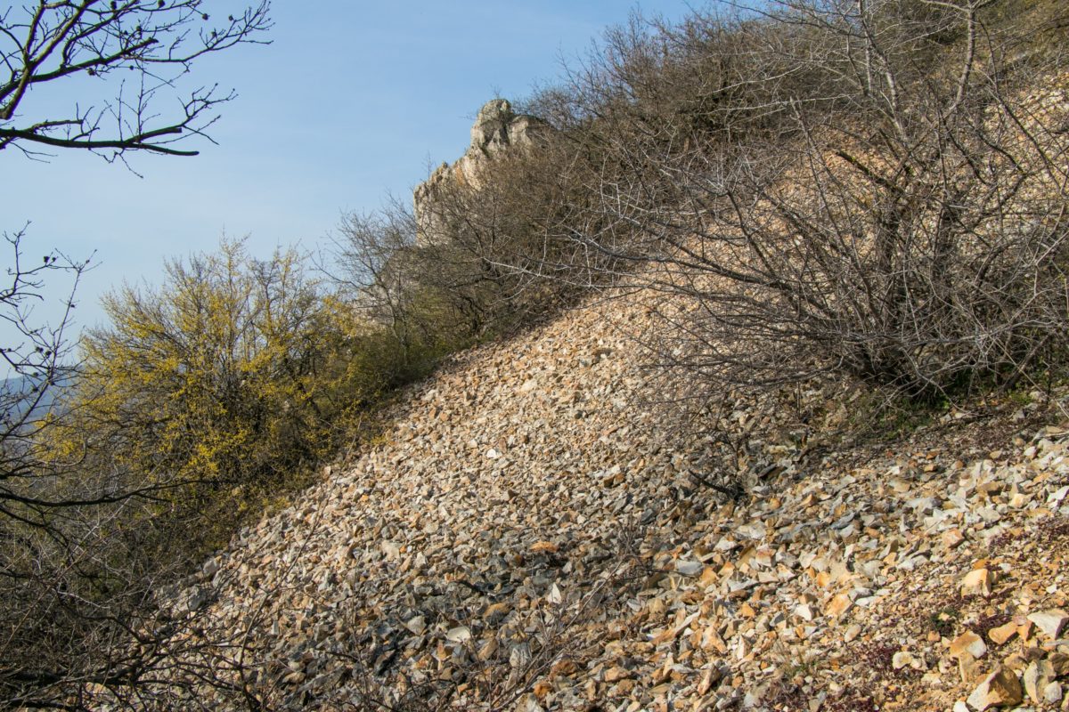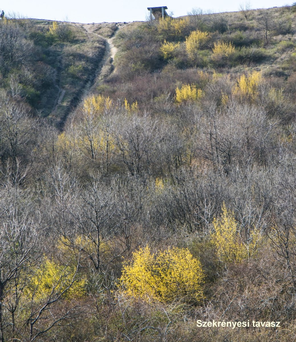 Ja, és a Szekrényes ormán látható kilövő-rámpa is a komplexum része volt, ahonnan gumikötéllel indították a gépeket. A meredek oldal ugyan még a tél szürkéjét mutatja, de már vidám sárga sombokrok tarkítják, s hívogatják az embert. Nekivágok a gerincre vezető meredeknek, hisz az onnan feltáruló panoráma is megér egy misét. Az alig párás, tiszta idő most sem csal meg… A 364 m magas Szekrényesről több csapás is vezet lefelé. Sorrento felé már sokszor mentem, s bármily szépek is azok a sziklák, most a gerincen dél felé indultam. Elhagyva a csúcsot jelző oszlop menti két sziklát, majd a mini-morénát, meredekebb rész következett. Szerencsére a dolomit-szirtekben néhány természetes lépcsőfok megkönnyíti a lejutást. Az erdő szélénél, még mindig jelzetlen ösvényre fordulva, vettem irányt a „hivatalos” turistaút felé.