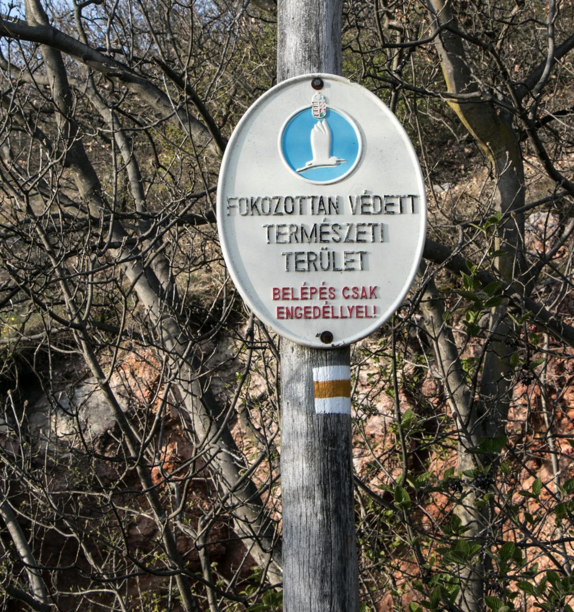 Elérve a sárga jelzést, már a célegyenesben voltam. Úgy látszik, a bezártságot nem csak jómagam viselem nehezen, meglepően sok kirándulóval találkoztam. Érdekes volt megfigyelni a gyorsan beépült pavlovi reflexet: egymás mellé érve, mindenki szorosan félrehúzódott a szembejövőtől… Hamarosan meglátom a Szállás-hegyre feljövő út netovábbot jelző masszív sorompóját, a turistaút innen jobbra tartva vezet. Többnyire a lakott terület szélén tekereg, itt-ott egy-egy divat-terepjáró is álldogál. Aztán – már nem először – érdekes táblán akad meg a szemem: aszondja, hogy „Fokozottan védett terület, belépés csak engedéllyel!” Értem én, hogy védeni kell megmaradt természeti értékeinket, de mi értelme van itt egy ilyen táblának? Évszázados, ma is sokak által járt turistaút, kutyába sem veszi senki ezt az amúgy teljesen felesleges tiltást.