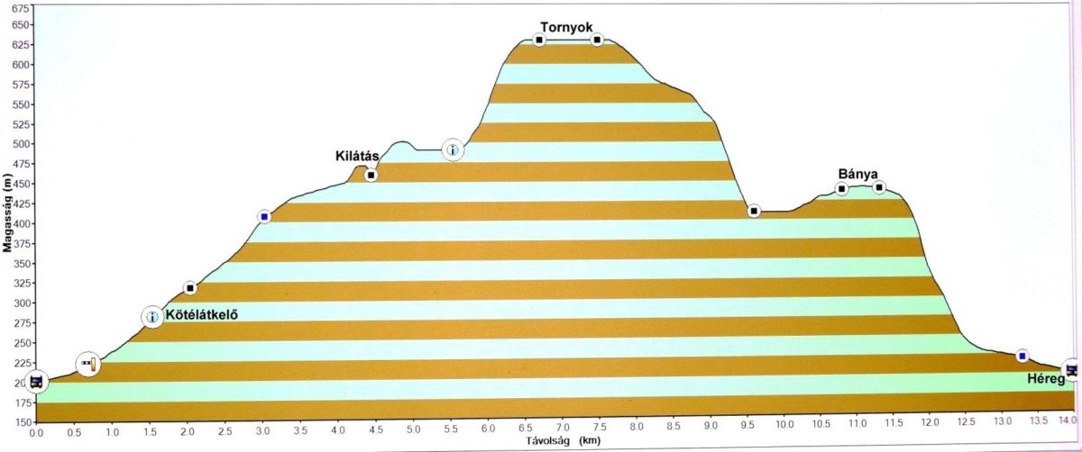 Héreg – kötél-átkelők – Király-kút – Serédi-kastély – TV-torony – mérőtorony – Tardosbánya-sziklái – Héreg.